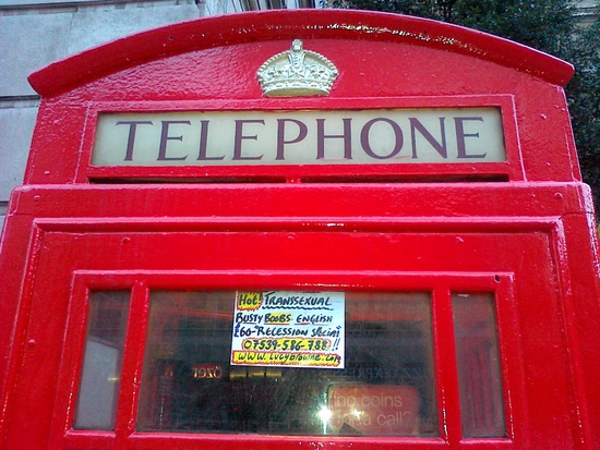 надпись на королевской телефонной будке в районе Оксфорд стрит: "горяченькие транссексуалы, с большими boobs по 60 фунтов, специальные скидки!