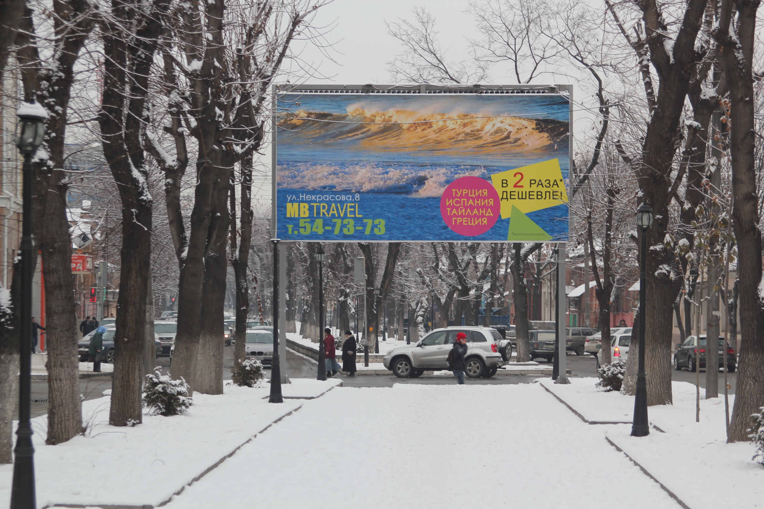 ну и сюда же несколько фотографий, сделанных в последние дни ушедшего года. тоже снежных. помню, день был такой холодный, руки мерзли камеру держать, а тут этот плакат. нормальные люди все на новый год в Тайланд улетели...