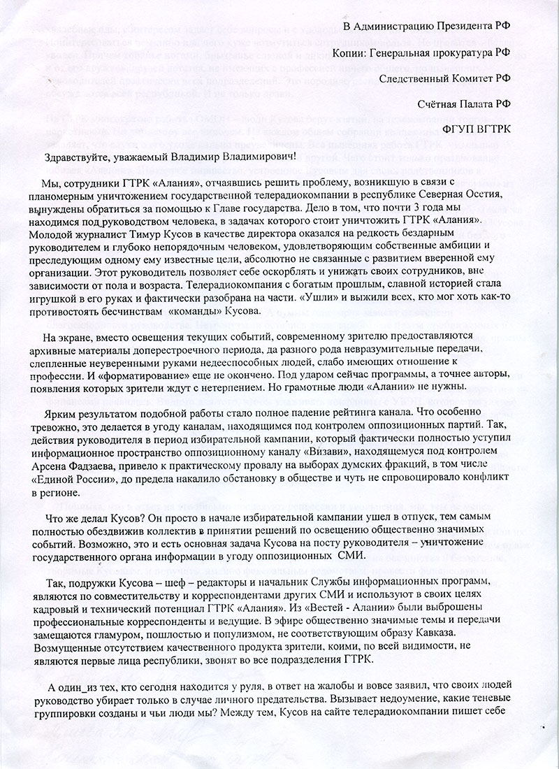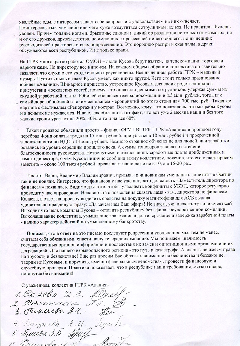 как оказалось, коллектив местного ГТРК требует уволить руководителя Тимура Кусова. в связи с чем, по сложившейся в обществе традиции обращается сразу к ВВП. за что и про что, читайте сами. опять же, я давно не бываю на ТВ, с тех пор как передача моя не выходит, года два, если не ошибаюсь, и не в курсе внутренних проблем. но читая это обращение, мне очень не понравилось то, что коллектив подписавшихся журналистов запугивает всех засилием "оппозиционных СМИ", которых, если уж говорить, в республике не существует. хотя, что тут говорить, сотрудники госоргана СМИ, все ясно и понятно. но все равно неприятно.