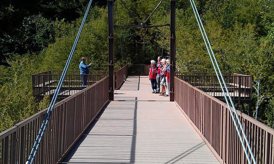 туристы идут по самому верху ущелья по подвесному мостику, прикрепленному к одной стороне ущелья.