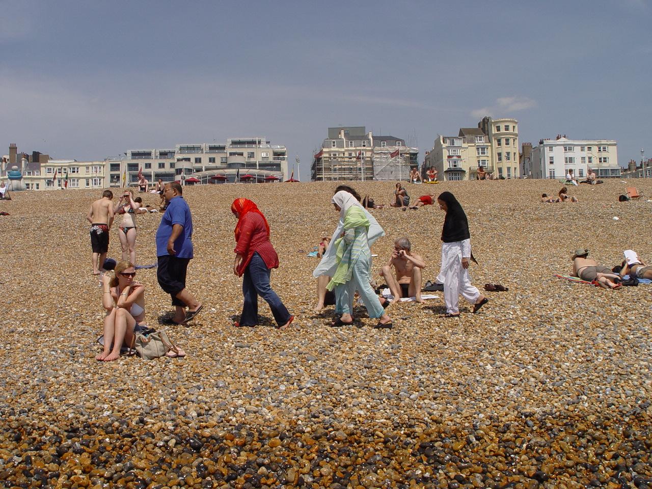 после последних обсуждений о многоженсте и тд, вспомнил об этой фотографии и решил поделиться. сделал ее в Брайтоне, Англия, на берегу Ла Манша, лет почти 10 назад. нравится эта картинка - пляж, полуголые европейцы и закутанные в платки мусульманские женщины. пузатый вожак, уж не знаю, муж он им, брат или кто еще, но точно вожак. столкновение культур в одном фото. а удивились бы вы, увидев такое, скажем, на водной станции во Владикавказе?