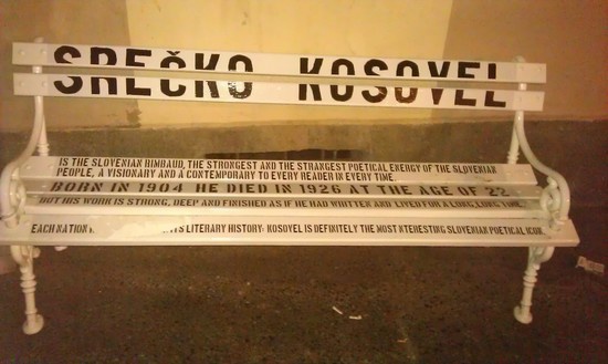 и вот параллель. встретил подобные лавочки в Любляне. на них цитаты культового словенского поэта Сречко Косовела. он прожил всего 22 года, умер в 1926-м, но считается в Словении поэтической иконой. голос бедных и угнетенных, но при этом модернист и реформатор.