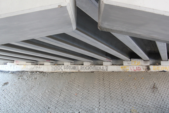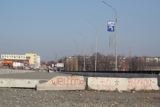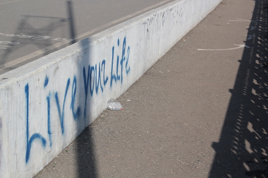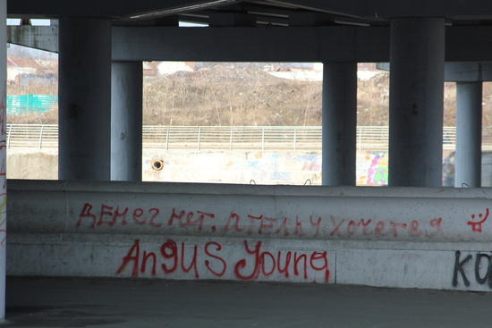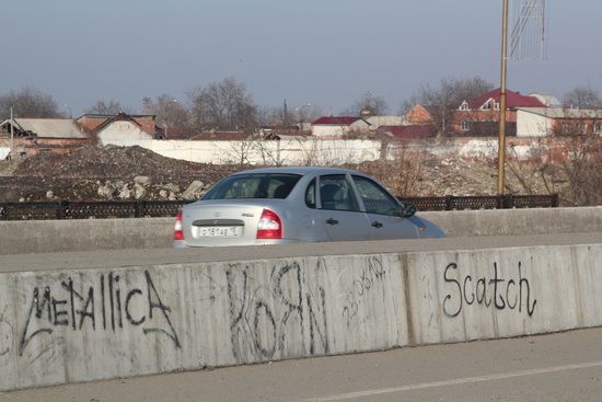 во Владикавказе есть т.н. "новый мост". его построили наверно лет 10 назад с расчетом снести ветхие дома в которые он упирается. но пока его строили, в эти дома под снос вписалось такое количество человек, что обеспечить каждого из них жильем оказалось не под силу. и мост много лет так и стоял без дела. за это время его облюбовали маргиналы и босяки. за это время он покрылся различными надписями и граффити. потом наконец мост открыли, но только одну половину, разделив ее тоже на две полосы. так он и стоит, полумост. я пошел туда зимой, чтобы снять видео о жизни моста, о его характере, но было туманно и я сделал только фотографии.
