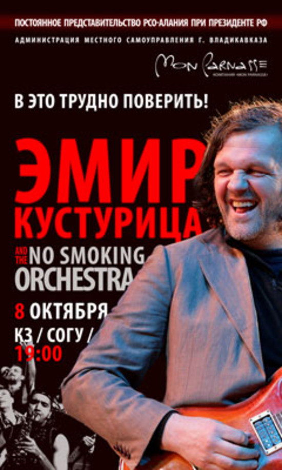 официально объявлено о концерте во Владикавказе популярнейшего Эмира Кустурицы и его взрывного No Smoking Orchestra. Грандиозная новость, очень здорово, со времен легендарного концерта Яна Гиллана в 89 году, во Владик никто из западных звезд такого уровня не приезжал. Кустурица явно заинтересован Осетией, ранее говорилось о том, что он дал согласие на съемки фильма об Осетии. Пока правда не совсем понятно что именно его здесь показалось привлекательным, что ему там в нашем поспредстве в Москве нарассказывали. Честно говоря, его фильмы я давно не смотрю, как-то он одну и ту же тему эксплуатирует в последнее время (исключение только "Марадона"), да и фанатом его музыкального творчества никогда не был. Но мои вкусы здесь точно не причем, он - мировая звезда, и это знаменательное событие для Осетии, и я очень надеюсь, что зал будет набит битком (а не солдатами).
