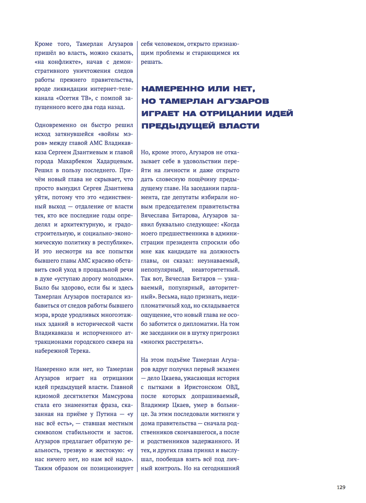 Повторится ли эта история в этот раз и не станет ли новый глава очередным «президентом несбывшихся надежд»? Пока говорить рано, миф о главе Осетии Тамерлане Агузарове, его «культ личности» только начинает формироваться в умах людей, и этот эффективный старт пока никого в заблуждение вводить не должен. Стоит только напомнить, что это уже второй не избранный, а назначенный руководитель республики, что формально лишает народ Осетии права с него что-то спрашивать, а его, в свою очередь, обязанности перед этим народом отчитываться.