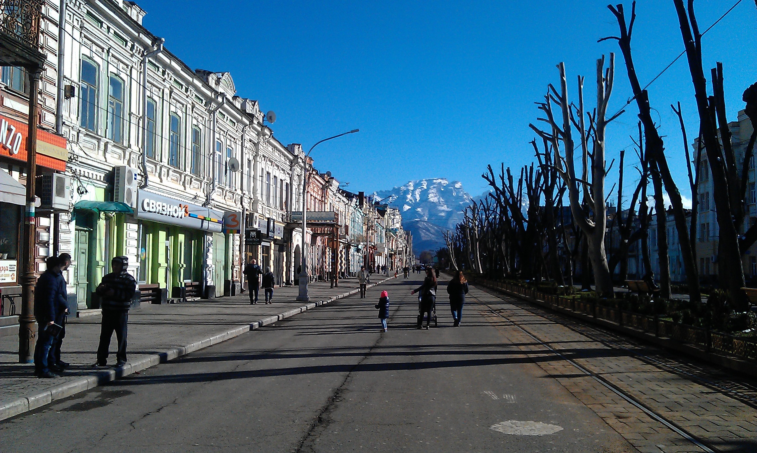просто шикарный вид на горы с нашего Проспекта мира, и даже подрезанные деревья его не портят. гулять там в такие дни одно удовольствие, особенно утром, когда он почти пуст, из "Винченцо" пахнет кофе и выпечкой, а радио "Город" начинает вещание с национального гимна, мне он очень нравится, такая воодушевляющая мелодия...