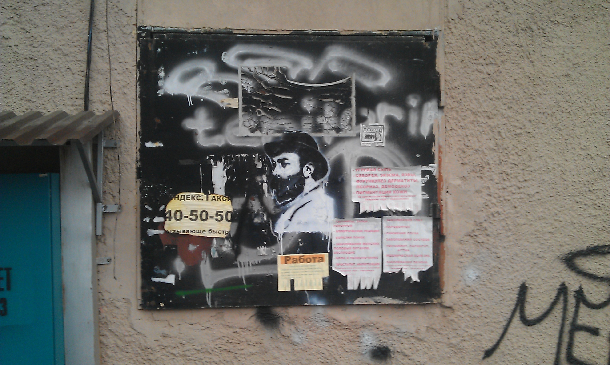 но есть и более спокойные, но также весьма растиражированные образы. например это изображение, которое я встретил в центре Владикавказа. здесь он какой-то обыденный, я бы сказал "городской", и все эти оборванные объявления вокруг только подчеркивают эту характеристику: