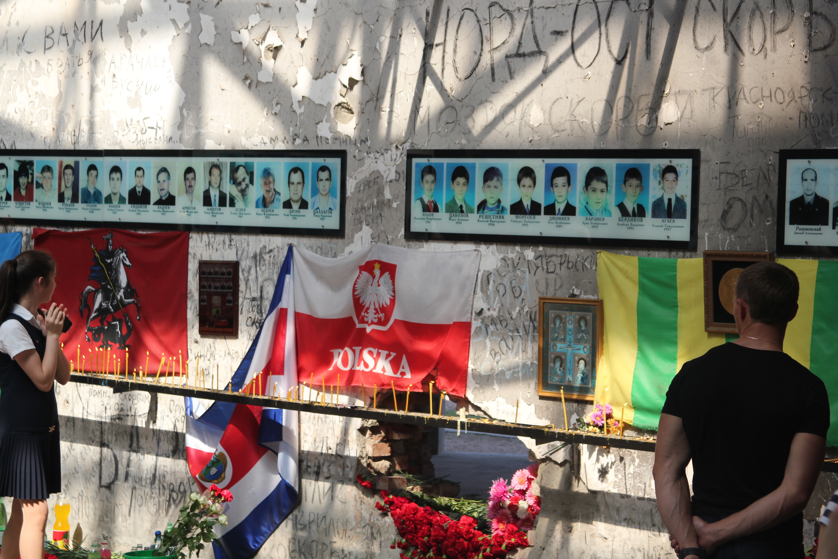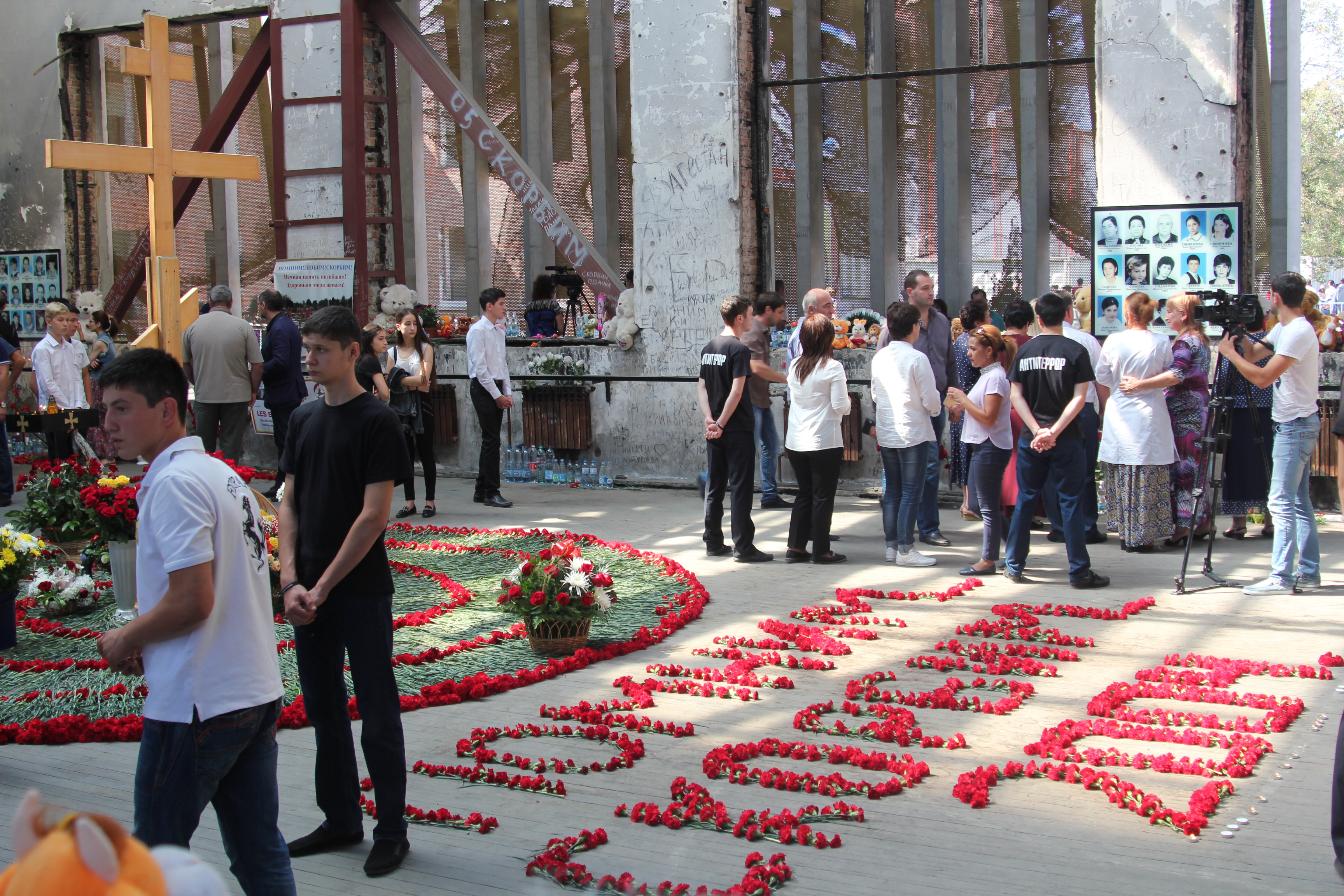 несколько фотографий с сегодняшних траурных мероприятий и короткое видео с минуты молчания в 13:02 - времени первого взрыва в спортзале школы.