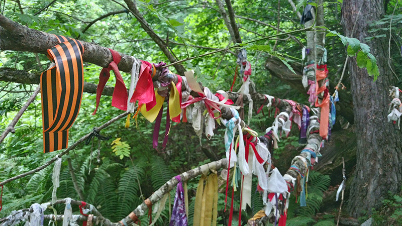 2. В лесу возле Рекома - одного из главных осетинских святилищ. Повязывая кусочек ткани на дерево возле святилища, вы просите о чем-то сокровенном. Что просят, повязывая георгиевскую ленту, я не знаю.