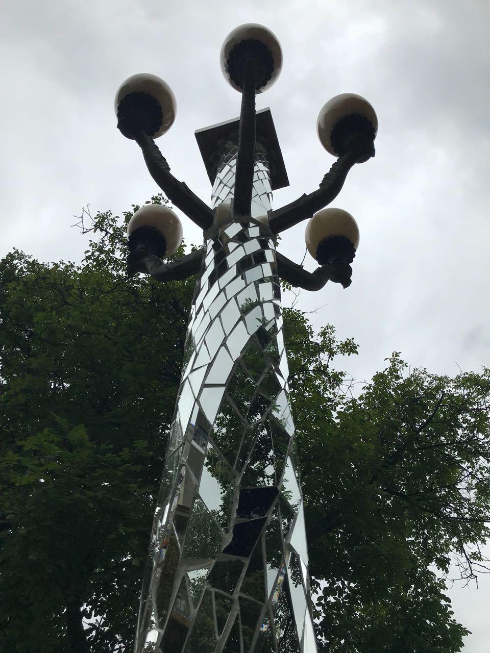 несколько дней назад повесил у себя в фейсбуке фото, где ребята из "Портала" работают над старым фонарем в центре города - обклеивают его кусочками зеркал. столб этот старый, но судить о его архитектурной ценности мне трудно. стоит в очень видном месте и сколько я его помню, он всегда был обшарпанный и раздолбанный.