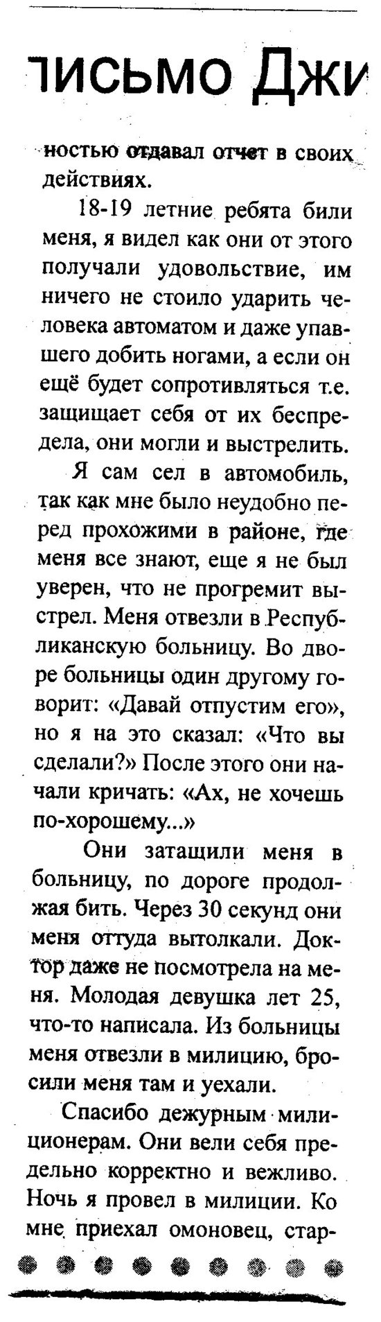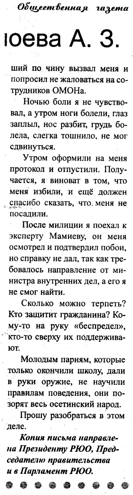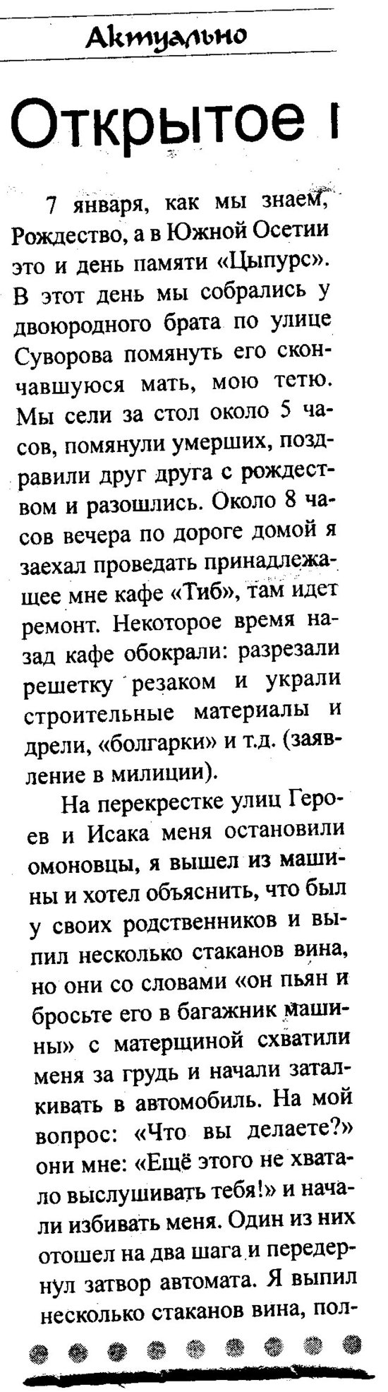 избили якобы за сопротивление ОМОНу, а задержали вроде как за то, что человек был очень пьяным. все это Микроб отрицает и связывает нападение с давлением на частных предпринимателей (у Микроба свое кафе). в новом номере цхинвальской газеты "21 век" Микроб сам рассказывает подробности того нападения, предлагаю к прочтению. но прежде еще одна новость. не так давно на Микроба было заведено уголовное дело по статье... нападение на сотрудников милиции.