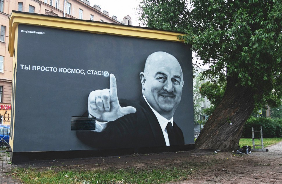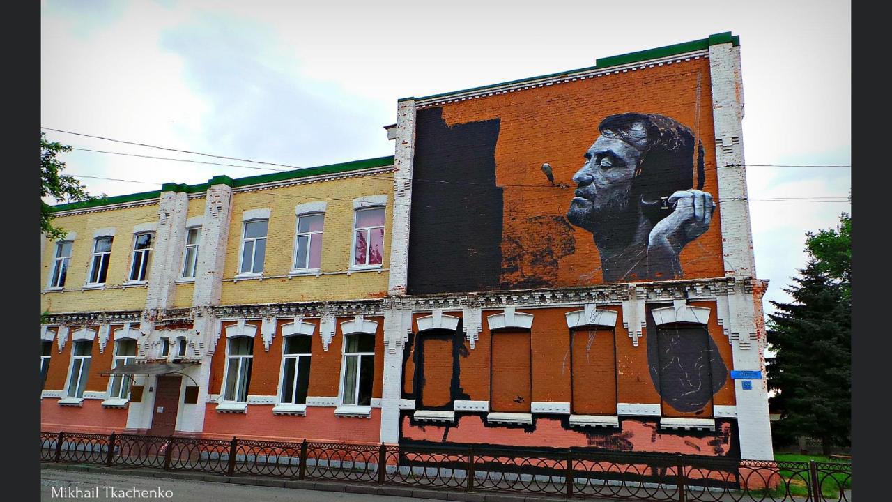 портрет нарисовали уличные художники из Белоруссии "HoodGraf". они известны своими работами Сергея Бодрова в Питере и Станислава Черчесова в Москве.