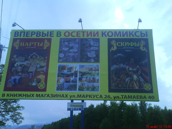 как видно из этого рекламного стенда, выпущена книга комиксов о похождениях нартов. а откуда еще взять рассказы об их похождениях, как не из Нартского эпоса? но я только "за". это нормальный шаг к популяризации истории среди детей. хотя, во Франции комиксы "Астерикс и Обеликс" читают все, вне зависимости от возраста, это настоящее достояние нации. так что, нарты в комиксах могут стать полезными не только для детей.