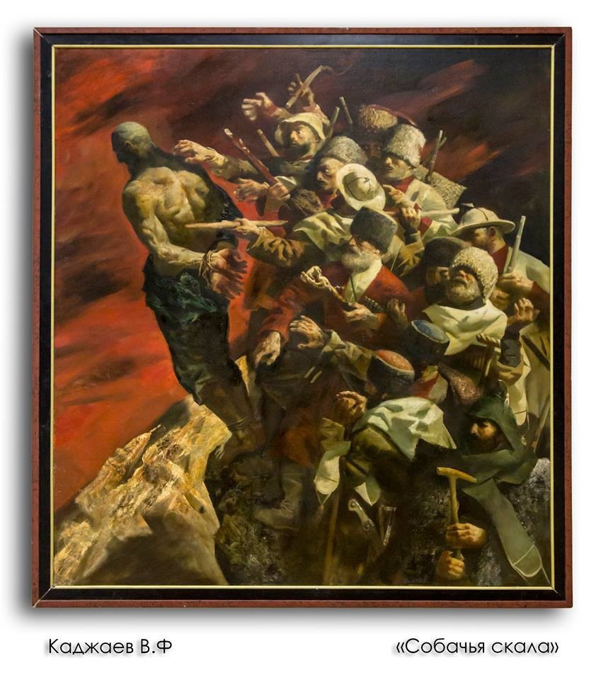 и в заключение картина. по легенде, приговоренных здесь к смертельной казни, бросали с т.н. "собачьей скалы" (село расположено на крутейшем обрыве на высоте 1500 метров. это действие изображали дважды осетинские художники.
