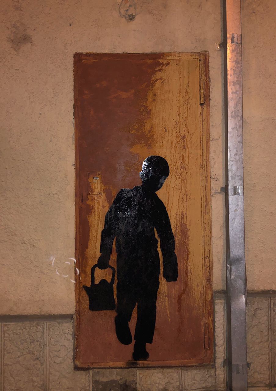 вот картинка еще интересней. она появилась во Владикавказе, но точно места не знаю. на ней мальчик, несущий чайник с кипятком. это отсылка к тому, как на площадь, где проводят круглосуточную акцию протеста родственники Инала Джабиева, силовики не пускали даже пронести кипяток. до этого не давали установить палатку, пронести газовый баллон для обогрева и тд. но какие-то мальчишки, дети совсем, смогли отнести туда чайник с кипятком.