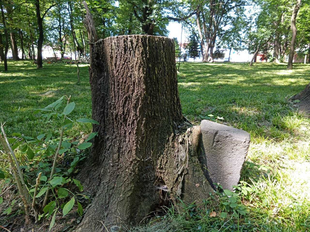 могильный камень не сдается и борется с пнем. городской сквер, разбитый еще в середине прошлого века на месте кладбища: