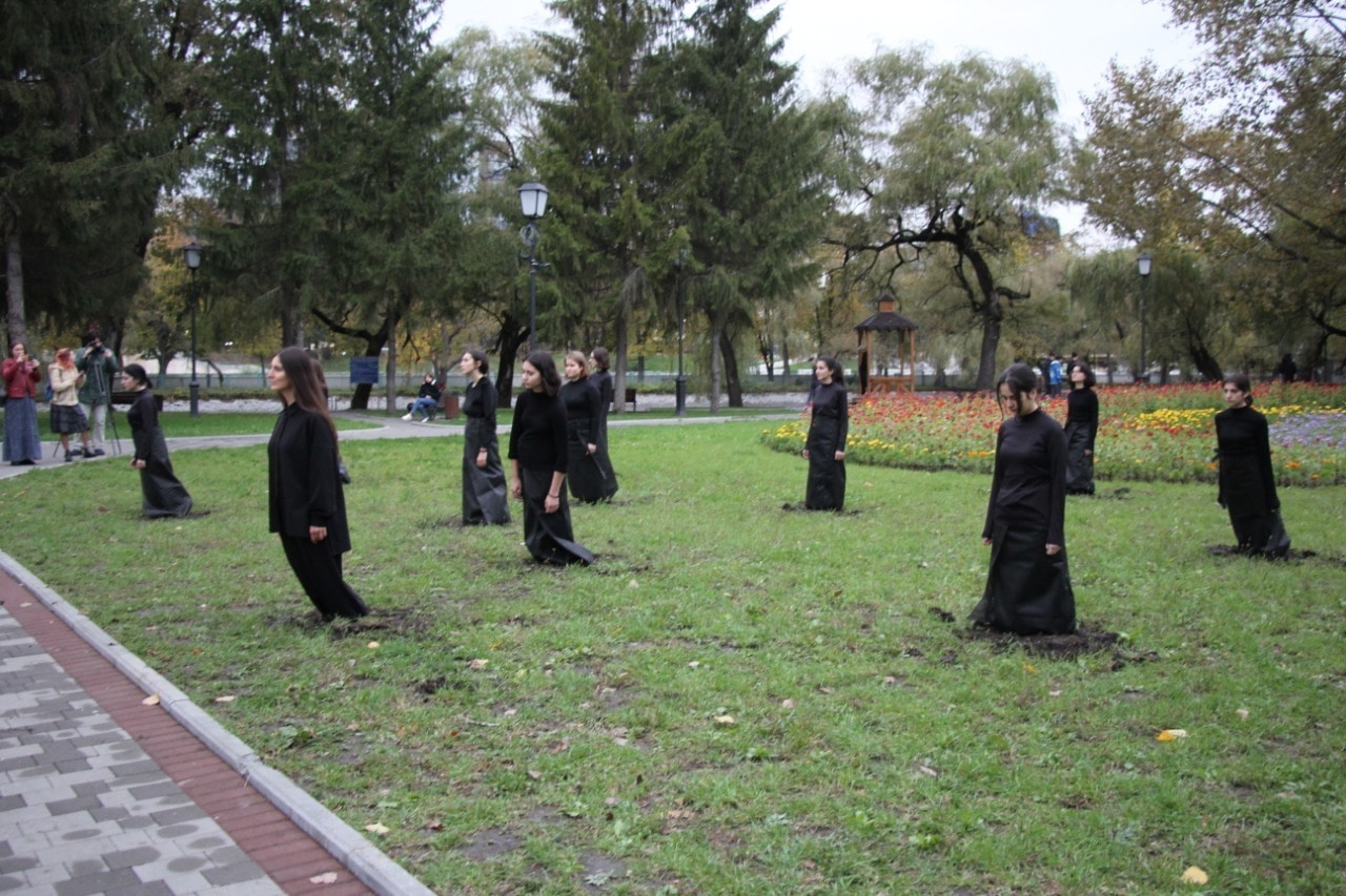 во Владикавказе вновь проходит "Аланика" - форум современного искусства. вот такой необычный перформанс я вчера наблюдал в парке - 12 девушек закопаны в землю почти по колено, раскачиваются из стороны в сторону под мрачную музыку. называется действо "Тæхуды" - в переводе с осетинского: "вот если бы", "хотя бы"... автор перформанса Сергей Катран.