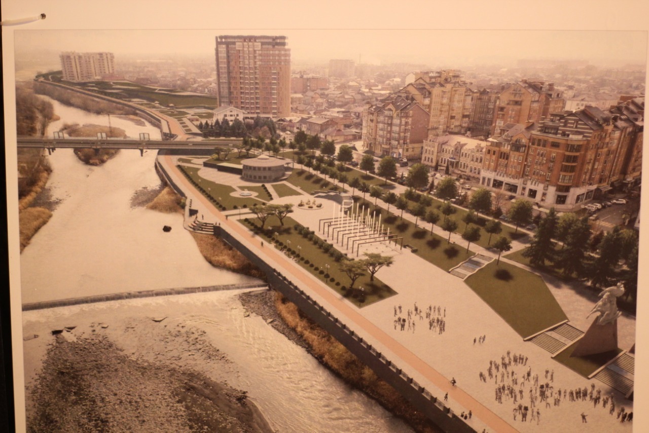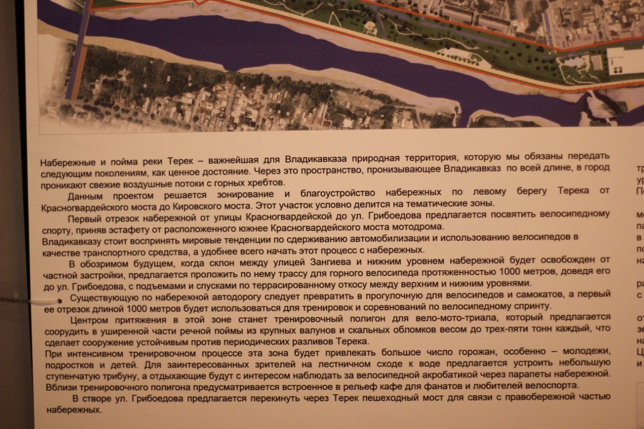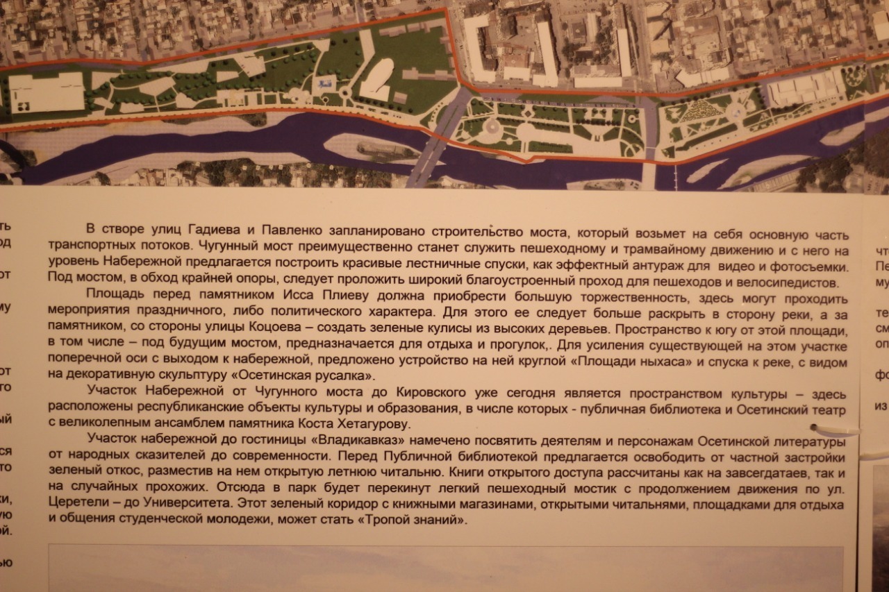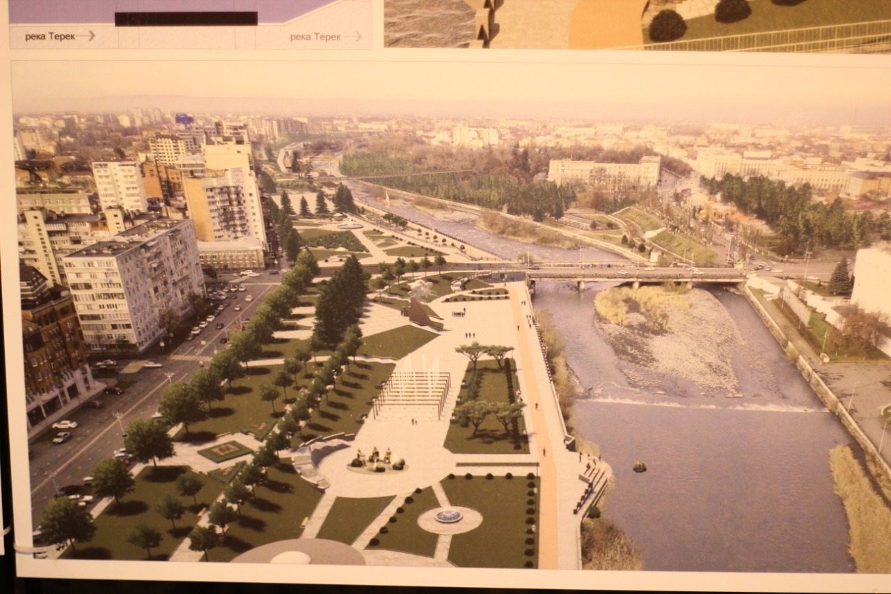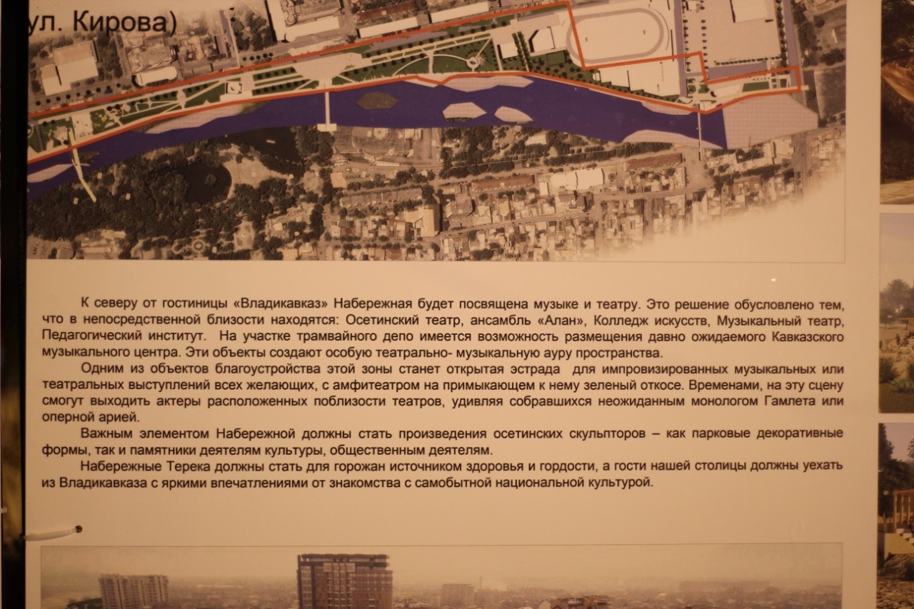 недавно появилась информация об очень масштабном проекте благоустройства всей центральной части набережной Владикавказа. с новыми тремя мостами через Терек (два пешеходных и один автомобильный), парковыми зонами, велодорожками и множеством еще всяких симпатичных деталей. основная концепция - гармония с природой. ну что ж, прекрасно. правда, не было фото. и вот появился баннер в центре города, где все это представлено, это и хочу показать. наверняка, жителям Владикавказа будет интересно как это себе представляют архитекторы. выглядит классно, современно, мне очень понравилось. например, очень здорово, что сделали специальные спуски к воде, причем оформили их в "диком" стиле, то есть, в естественном. пока, правда, ничего не говорится о сроках реализации. очень хочется верить, что это не останется на бумаге, как много чего из недавней истории Осетии.