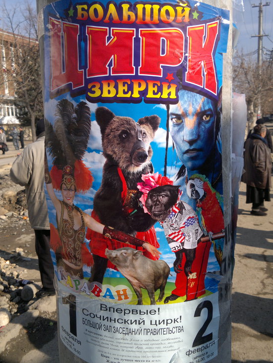 прислали пару фотографий из Цхинвала. Гастроли сочинского цирка в Южной Осетии. В программе Белый медведь умка и маленькие медвежата. Приходите все в большой зал заседаний правительства.