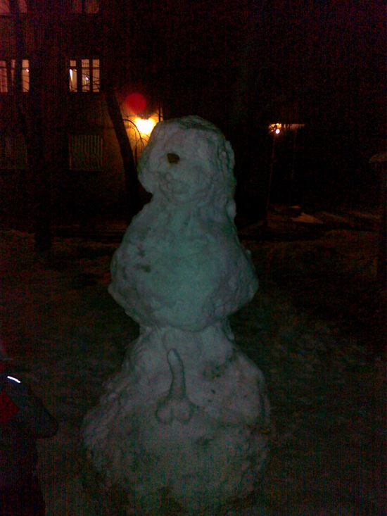 а те, кто это слепил не дебилы? я поломал эту конструкцию после того как сфотографировал, но не перестаю удивляться откуда столько пошлости на улицах. когда же люди перестанут лепить половые органы из снега и писать на заборах слово из трех букв? может это я такой нежный не знаю, но нет сил на все это смотреть, нет сил все это с экрана телевизора воспринимать. просыпаешься, включаешь ящик, а там эта блевотная сериальная пошлость, с самого утра, секс, члены и так далее... да даже когда недавно Малышева показывала свое скандальное "про мужской половой член", это же было просто отвратительно. я бы наверно вообще запретил в дневное время даже произносить с экрана такие вещи как "половые органы". ну или если это медицинская передача, то как-то иначе это делать, не знаю. пока такое ощущение, что у людей атрофированы и мозги и половые органы. блевотное, пошляцкое российское ТВ и такие же картины на улицах...