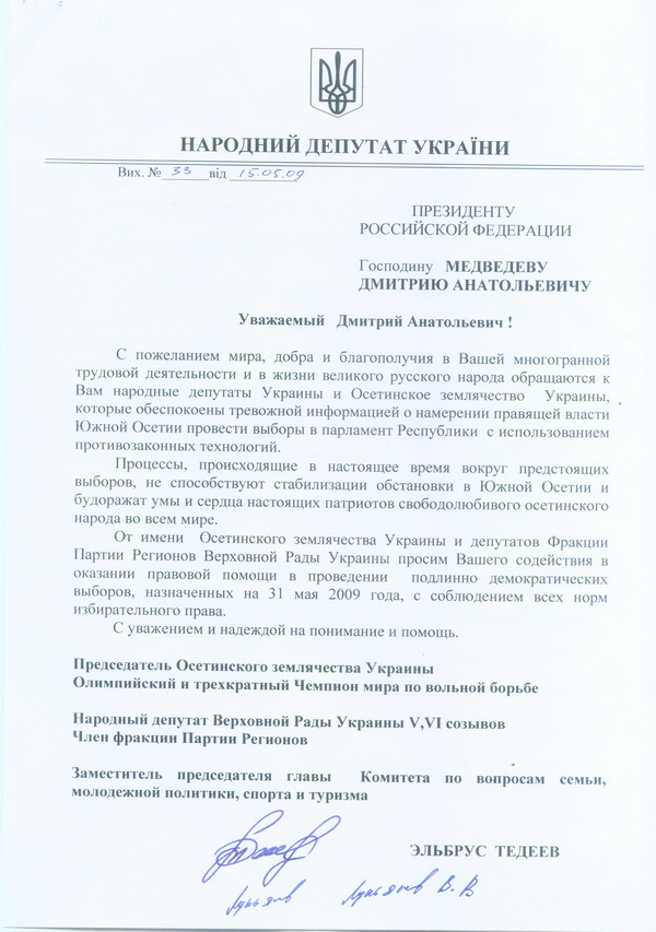 Вообще-то не понимаю чего они могут этим добиться, не верю в их успех бойкотировать и сорвать выборы. Тем не менее, поддержку им высказал украинский депутат Эльбрус Тедеев и еще несколько депутатов украинской Рады. Письмо Тедеева на имя Дмитрия Медведева ниже.