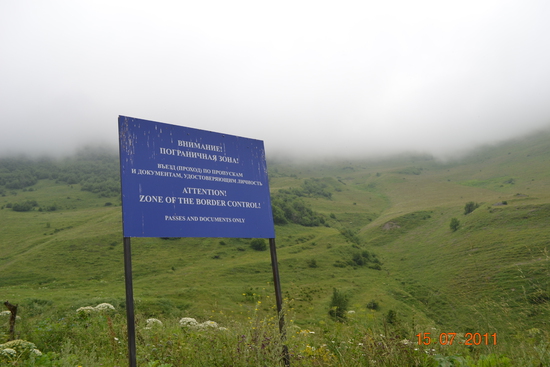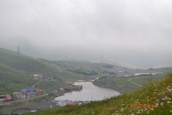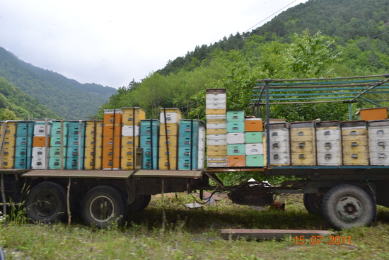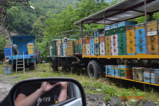 в городе было солнце, а как только въехали в ущелье, сразу попали в густой туман, и по дороге ничего сфотографировать не смог. ну разве что эти передвижные ульи на обочине. а жаль, местность красивейшая, вся в густой зеленой растительности. на верхней точке перевала телефон показал высоту 1890 метров.