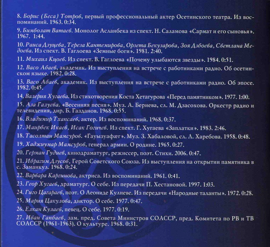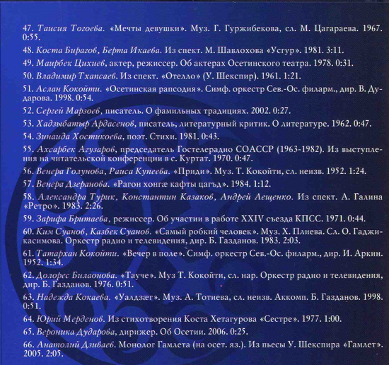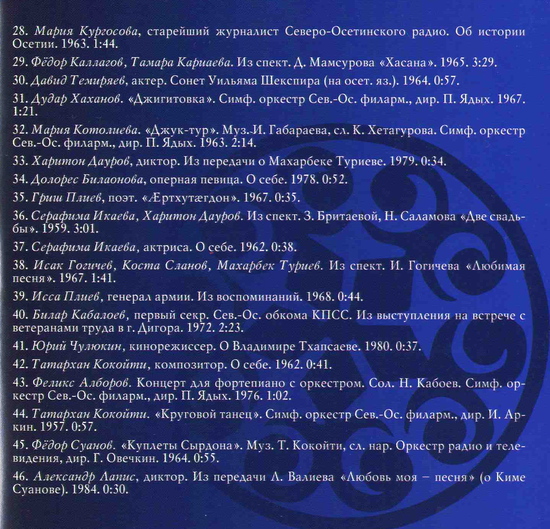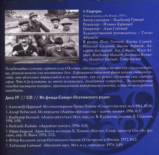 недавно был приглашен на юбилей ГТРК "Алании", в осетинском театре. масштабное мероприятие, весь бомонд Осетии в расширенном составе. отличный концерт на хорошем уровне, много гостей из других республик. кадры осетинской кинохроники на экране, и вообще много ностальгии по тем временам у собравшихся, композиторы, фильмы, фотографии... приятное в общем было мероприятие. все гостям дали по огроменной книге об истории ГТРК и кинохроники. культовое издание, я считаю. ну и диск из четырех частей. на первых трех фильмы, а на четвертом записи из фонда североосетинского радио. есть интересные моменты, решил выложить кое-что. ниже скан диска, если что-то захочется услышать из списка там, говорите, добавлю. а пока это.