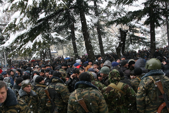 13:57 Аллу Джиоеву и генерала Баранкевича под давлением толпы пропустили в дом праительства, но журналистов не пустили.