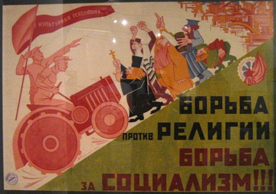 - На плакате каток культурной революции сметает со своего пути и христианство, и ислам, и иудаизм (символами которых в плакате являются служители соотвествующего культа) и идет "в гору" к светлому индустриальному будущему.