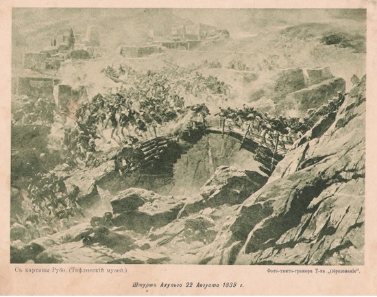 Гравюра с картины "Штурм аула Ахульго" опубликована на сайте http://murtazali.livejournal.com/pics/catalog/750/75802