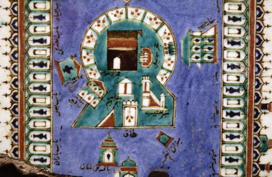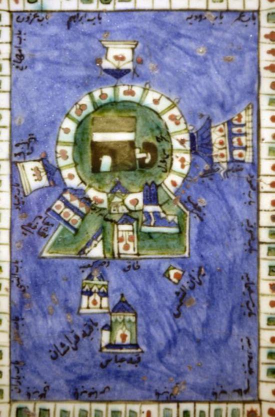Последняя четверть 16 века. Изразец из Изника. Комментарий из музейного каталога: «Это изображение Каабы, небольшой храм расположен недалеко от центра Главной мечети Мекки и рассматривается мусульманами всего мира как самое священное место на земле. Мусульмане ориентируются на эту святыню во время ежедневных молитв, когда хоронят своих покойных и стремятся совершить паломничество, хадж, в соответствии с предписанием Всевышнего, ниспосланным в Коране». Музей Исламского искусства в Стамбуле