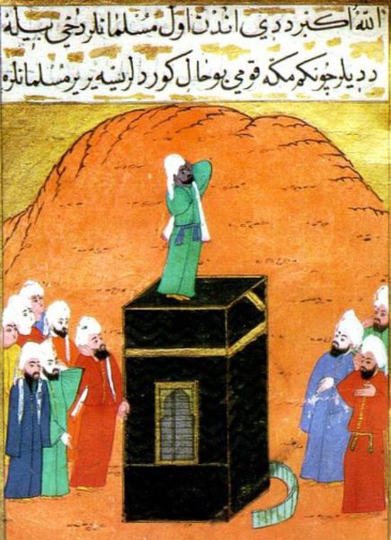Билал ал-Хабаши, первый муэдзин Ислама, на крыше Каабы. Персидская миниатюра. Билал изображается созывающим верующих на молитву. Билал, имя которого популярно среди мусульман Африканского Рога, сражался вместе с Пророком в самых критических битвах ранних лет Ислама. Он жил какое-то время в Басре, главном портовом городе на юге Ирана, перед возвращением в Аравию. Большое уважение, с каким мусульмане Индийского океана относятся к Билалу, особенно заметно в странах Персидского залива со стороны музыкантов африканского происхождения. В Пакистане песни религиозного содержания – включая песни мусульман неафриканцев – восхваляют его; и в Африке и Турции муэдзины буквально благоговеют перед первым муэдзином Ислама. Призыв Билала продолжают слышать во всей умме.