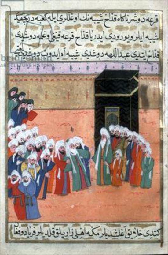 Мухаммад, призывающий верующих на молитву, подвергается нападению курайшита-язычника Абу Джахла. Извлечение из турецкого текста Siyer-i Nebi: Жизнь Пророка. Стамбул, 1595. Siyer-i Nebi – это турецкое эпическое повествование о жизни Мухаммада, созданное около 1388, написанное Мустафой, сыном Юсуфа из Эрзурума, дервишем ордена мавлавийя по поручению Баркука, мамлюкского правителя Каира, черкеса по происхождению. Текст основан на арабском тексе Вакиди. Османский правитель Мурад III (1574-1595) приказал, чтобы текст был иллюстрирован. Иллюстрации Лутфи Абдуллаха, он возглавлял мастерскую во дворце султана и завершил работу при преемнике Мурада Мехмете III, 16 января 1595. Вся работа содержит 814 миниатюр в шести томах.