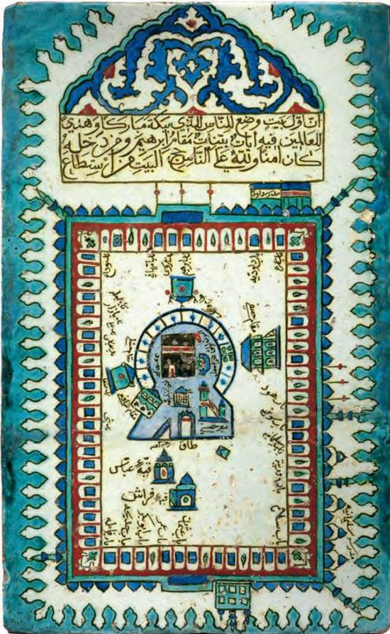 Украшенные характерным для османской керамической палитры бирюзовым, синим кобальтом, зеленым и красными цветами на белом фоне, такие плитки производились в 17 веке. Они часто размещались на различных зданиях, чтобы указать для мусульман географическое направление на Мекку. Эта плитка отражает уровень топографии в Османской империи и давние исламские традиции в изображении Мекки. Музей Ага Хана
