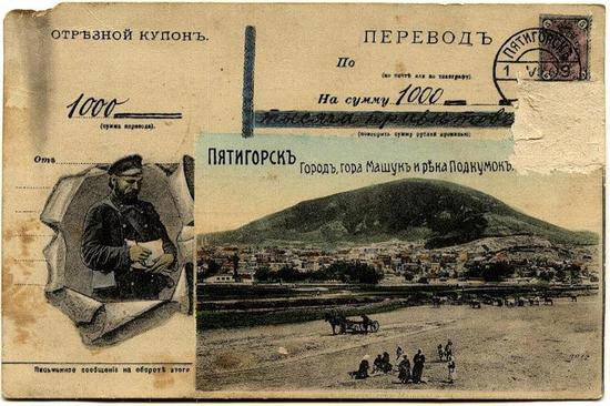 «Иногда к такому почтальону на открытке крепился миниатюрный, но самый настоящий кожаный портфельчик. Его можно было открыть и даже извлечь бумажную ленточку, сложенную гармошкой, на ней печатались виды лермонтовских мест Пятигорска. Иногда обыгрывался сюжет и с почтовым переводом, только вместо тысячи рублей там значилась тысяча приветов. Впрочем, иногда речь заходила и о реальных деньгах, ибо беззаботная курортная жизнь требовала значительных расходов. Лаконичный и вполне понятный нам сегодня рассказ в картинках на эту тему помещен на открытке под названием «Сердечный привет из Пятигорска».»