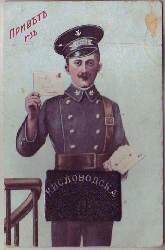 Некоторые сюжеты открыток, посвященных отдыху на Кавказе, пишет Николай Маркелов в статье « Привет с Кавказа, или О чем рассказали старые открытки…», «относились именно к почтовой тематике, на лицевой стороне был изображен почтальон в форменной одежде и фуражке с номером, имелась и надпись «Привет с …».