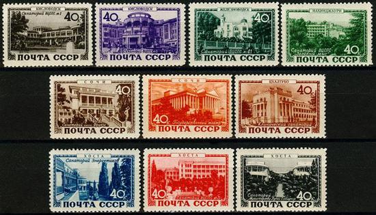 В СССР из открыток уходит лирическо-игривое настроение, здесь уже не увидишь влюбленные парочки, одни виды моря и гор. Но таким же источником информации о курортах, как открытка, становится марка : в СССР четырежды издавалась серия «Курорты СССР», в 1939 и 1946 и 1947, 1968