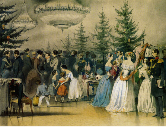 Немецкая принцесса ввела при дворе обычай украшать новогодний стол букетиками из еловых веток. Вскоре князь Николай Павлович по настоянию супруги впервые поставил в Аничковом дворце новогоднюю елку. В 1825 году в Петербурге впервые установили публичную елку. Новогодние игрушки тогда не были приняты и елку наряжали фруктами и конфетами.