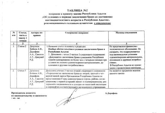 Кто бы мог подумать, но с инициативой разрешения многоженства в Адыгее выступал депутат генерал Дорофеев. Предлагаю Вашему вниманию уникальный документ – поправки к соответствующему закону, отклоненные парламентом Адыгеи в начале 1990-х. Обратите внимание, что поправка о возможности заключения второго брака (и даже третьего и четвертого) была отклонена только потому, что в РА «не принят закон о прожиточном минимуме». Как знать, был бы принят такой закон в 1990-е – возможно, известную песенку о том, «если б я был султан», многие бы распевали в Адыгее на законных основаниях?