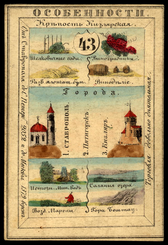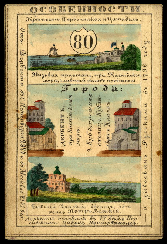 Посмотрим, на примере этих сувенирных карточек, в каких образах в Российской империи середины 19 века формировалось представление о Кавказе… Образы горцев (в том числе и «немирных»), церкви как символы трансляции православия; тема минеральных вод и портов; и, наконец, «Ханский дворец» в Дербенте, где останавливался Петр Великий, тоже неслучаен – он формировал представление об утверждении империи на Кавказе в 19 веке как о возвращении к делу Петра в веке 18-ом.