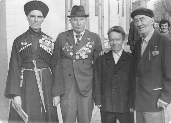 Встреча с ветеранами ВОВ, Майкоп. Справа - Ю.К. Намитоков, следующий - его коллега Илья Степанович Заблодский. Начало 1990-х гг.