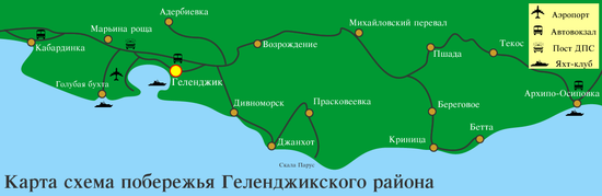 Дивноморское - поселок на берегу Черного моря, в 8 км к юго-востоку от Геленджика. Старое название поселка (до 1964 г.) — Фальшивый Геленджик. Фредерик Дюбуа де Монпере, швейцарский француз, автор шеститомного "Путешествия вокруг Кавказа", опубликованного в 1839-1843 гг. в Париже, называл это местечко Ложный Геленджик. Бухта в устье р. Мезыб при взгляде со стороны моря имеет некоторое сходство с Геленджикской бухтой. Бытует легенда, что во время Кавказской войны, после основания Геленджикского укрепления (1831 г.) турецкая эскадра, скрытно подошедшая к Геленджику ночью, была дезориентирована сигнальными огнями, разожженными в устье р. Мезыб, и обрушила всю огневую мощь корабельной артиллерии на это пустынное в то время место. В результате Геленджикское укрепление осталось нетронутым, а устьевая часть долины р. Мезыб и образовавшийся здесь впоследствии поселок стали называться Фальшивым Геленджиком.
