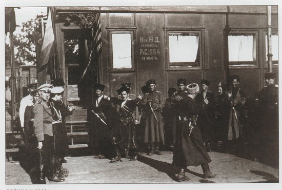 Горцы в армии Колчака танцуют лезгинку у вагонов поезда.