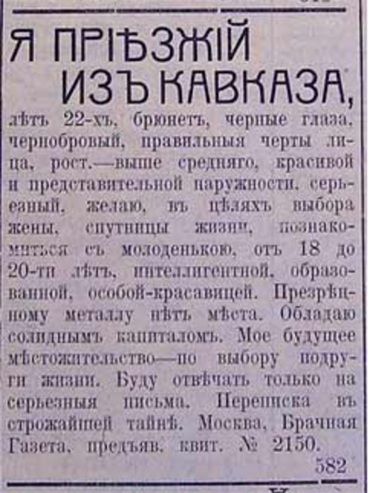 молодой кавказец, всесторонне образованный (медик 4-го курса, он же филолог), твердым характером (но мягкой душой), степенный (не пьет, не курит и не играет в карты), идеальной чистоты и с неисчерпаемой энергией жить мыслить и любить, желает познакомиться с нежно-красивой, интеллигентной, музыкальной (и не мешало бы богатой) барышней или молодой женщиной. Цель - брак, тайну переписки безусловно гарантирую. Расстоянием прошу не стесняться. Юрьев- Дерпт, почтамт, предъяв. почт. квит. №685 (БГ. 16 (03) января 1910 г.).