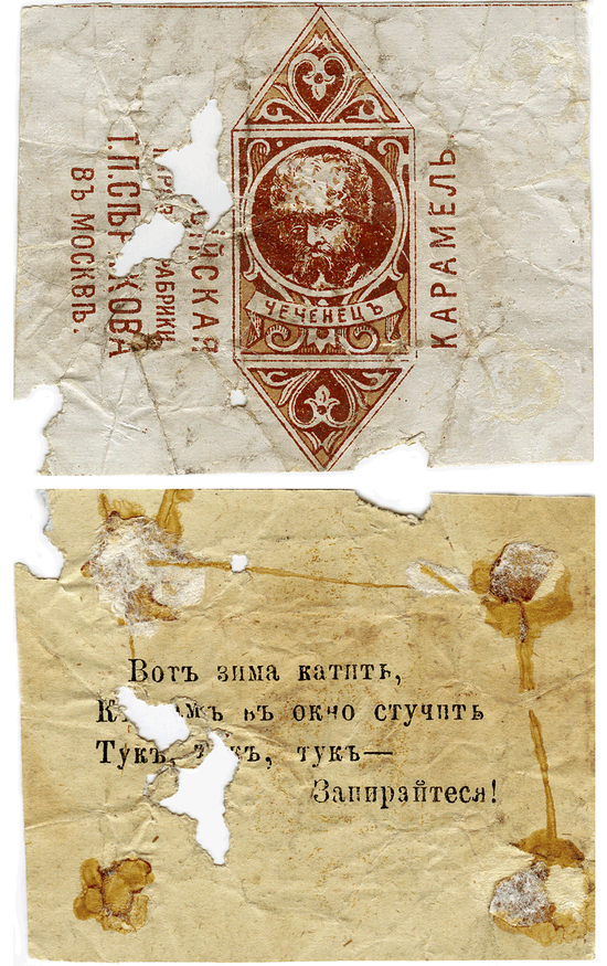 Учитывая то, что конфеты и шоколад расходились по «всей Руси великой» и были рассчитаны на все сословия, то шоколад с кавказскими типажами работал как Текст, в котором адресату, проживающему за тысячи километров от Кавказа, доносили информацию об этом регионе. И этот сладкий текст работал быстрее и эффективнее газеты или энциклопедии, рассчитанной на образованную публику.