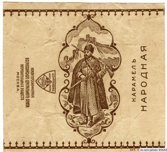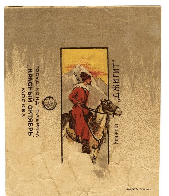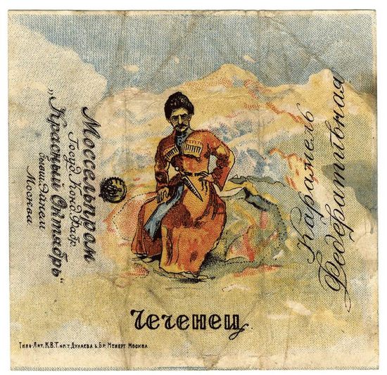 В 1920-30 е гг. фабрика «Красный Октябрь» (к тому времени это - национализированная фабрика Эйнем, сначала получившая название «Государственная кондитерская фабрика №1, бывшая Эйнемъ», а с 1922 года - «Красный Октябрь») выпускает очень интересные серии— карамель «Федеративная» и карамель «Народная». В галерее этнографических образов Федеративной карамели среди карамели «Киргиз», «Сарт», «Башкиры»,«Лопарь» «Калмыки» есть и карамель «Чеченец». А в серии «Народная карамель» - карамель с изображением горца в черкеске на обертке.