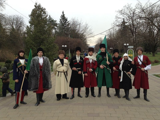 В Нальчике молодежь возрождает традиции мужского костюма. Где черкеска - там и пояс. Фото 5 апреля 2014.