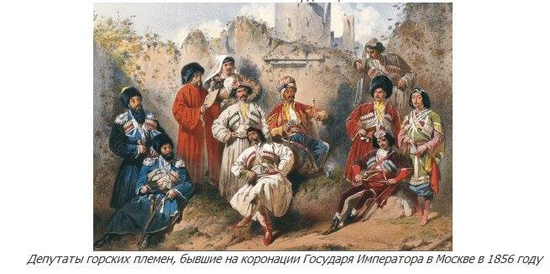 «Делегации народов Кавказа, вошедших в состав Российской империи, приглашались на торжества по поводу коронации императоров, как и все остальные поданные. Известно, что по указанию Николая I на его коронации, состоявшейся в Москве 22 августа 1826 г., присутствовали депутаты из областей Кавказа, находившихся в военном управлении. Начиная со второй коронации Николая I, проходившей в Варшаве 24 мая 1829 г., российских императоров на торжествах сопровождал личный конвой, в котором служили представители многих кавказских народов.