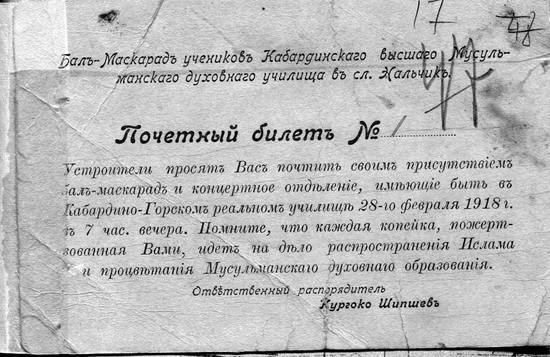 Несколько месяцев назад в одной из черкесских групп на фейсбуке был выложен очень интересный архивный документ, датированный 1918 г. Это приглашение (почетный билет) от учеников Кабардинского высшего мусульманского духовного училища в Нальчике на благотворительный бал-маскарад в стенах Нальчикского (Кабардино-Горского - в документе) реального училища. Казалось бы, документ вызывает только улыбку и кажется забавным — подумать только, какой маскарад и бал могли позволить себе студенты духовной семинарии, готовящиеся стать имамами и степенно заседать на важных мероприятиях рядом с областным начальством?