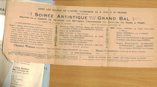 На этот раз Маирбек предоставил для публикации еще один интересный документ из своего архива – объявление о вечере в отеле Кларидж, организованном Comite de Secours des Refugies Circassiens du Caucase du Nord a Paris, т.е. Комитетом помощи черкесским беженцам с Кавказа.